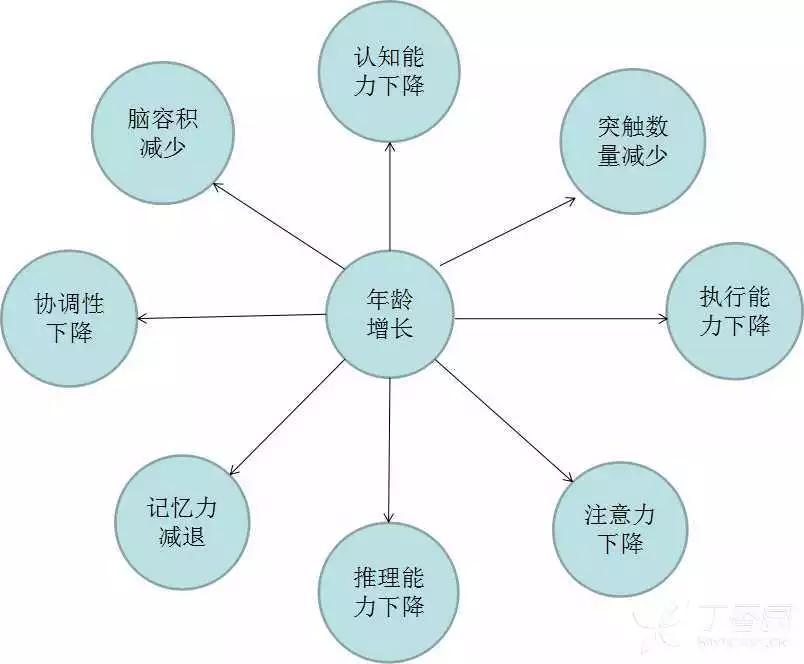 随着年龄的增长,CT/MRI 显示脑室增大、脑体积减小、神经元萎缩、突触减少(图 1);