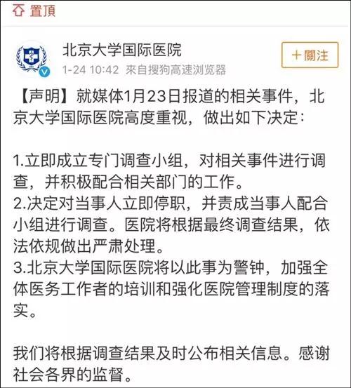 对此,北大国际医院24日上午在微博回应称,已成立专门调查小组,对相关事件进行调查;决定对当事人立即停职,并责成当事人配合小组进行调查。医院将根据最终调查结果,依法依规做出严肃处理。北大国际医院表示,将根据调查结果及时公布相关信息。