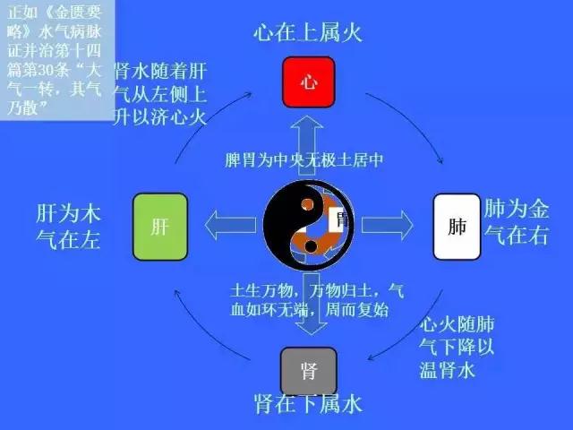 这是我常用的一个五大脏象方位图,还有这个轮轴辐辏理论,这个中医的咱们认为呀,脾胃为气机之枢,枢,轴也,就在中间,它像一个轴。肝在左侧,属木;心属火,在上;肾属水,在下;肺属金,在右侧。这像一个车轮子一样,在运转。乌梅丸的药物方位就是,按我的理解就是按图上这种方向,这个轮子运转的动力的源泉就是肝木,生于水,长于土,化为火,降于金,归于水。我们这个轮子的动力来自两个方面:一个是肝木的一曲一直,推动这个轮的运转;在里面呢,由己土——脾,由左向右运转;戊土胃,由右向左运转,外边的轮子转,里边的轴也跟着转。如果这两个轮子,运转得流畅,人体就不会有病。具体的药物我在这里不再细讲,我的理解就是放在这的,放在这个图上。