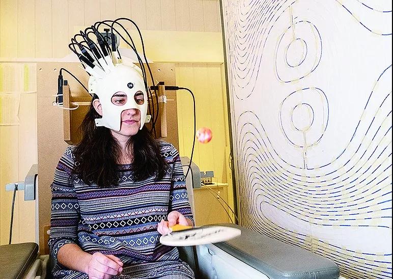 通过脑磁图(MEG)可以看到大脑内的电活动,但是能够做到这一点的设备——SQUID(超导量子干涉设备)非常巨大而沉重。能用MEG来研究正在移动的人吗?来自英国诺丁汉大学和伦敦大学的科学家们设计了一种轻便、舒适的头戴式光泵磁力仪OPM-MEG,可以完美地解决这个问题。这种磁力仪“头盔”由3D打印而成,重量仅905克,而且能“私人订制”,以保证传感器与每个测试者的头皮表面直接接触。测试者戴上这种“头盔”后,仍然可以自由地进行头部活动。