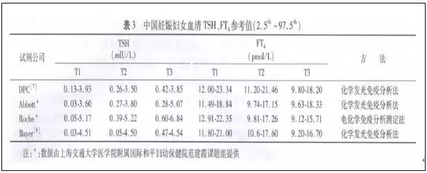 图1:我国2012年《中国妊娠和产后甲状腺疾病诊治指南》推荐的妊娠妇女血清TSH、FT4参考值(来源于指南里的截图)