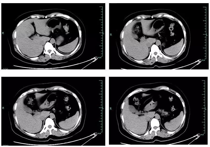 图 2:腹部 CT 显示胃小弯侧异物延续至胰腺颈体部
