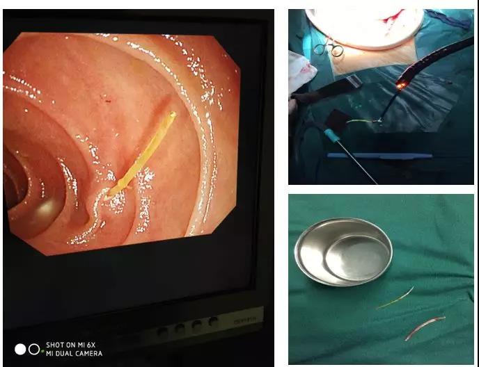 图 5:十二指肠水平部鱼刺嵌入肠壁,内镜下取出