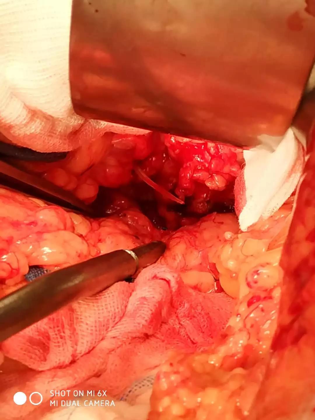 图 4: 术中所见:鱼刺穿透胃壁进入腹腔到达胰腺颈体部,同周围组织包裹黏连致密