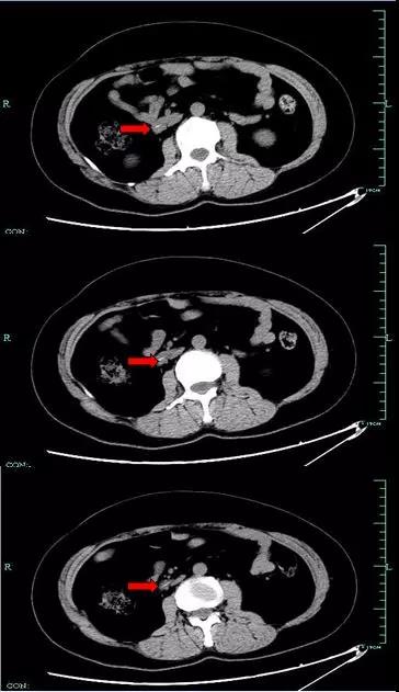 图 3:腹部 CT 提示十二指肠水平部异物(红色箭头表示异物)