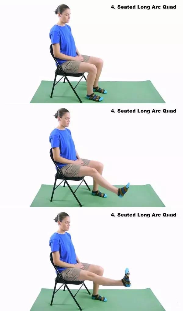 坐在椅子上,膝关节伸直同时勾住脚尖,用力使整条腿绷直并保持水平状态。