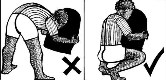 直膝提重物时,不能有效发挥髋、膝关节周围肌肉的力量,腰背筋膜、肌肉、韧带往往因为负担过重而受伤,也对腰椎不利。