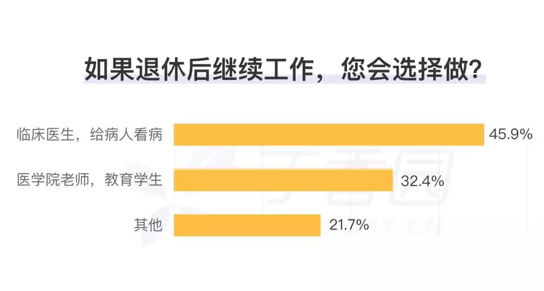 而且,45.9% 的参与者表示,如果退休后继续工作,会选择给病人看病,32.4% 选择做医学院老师。