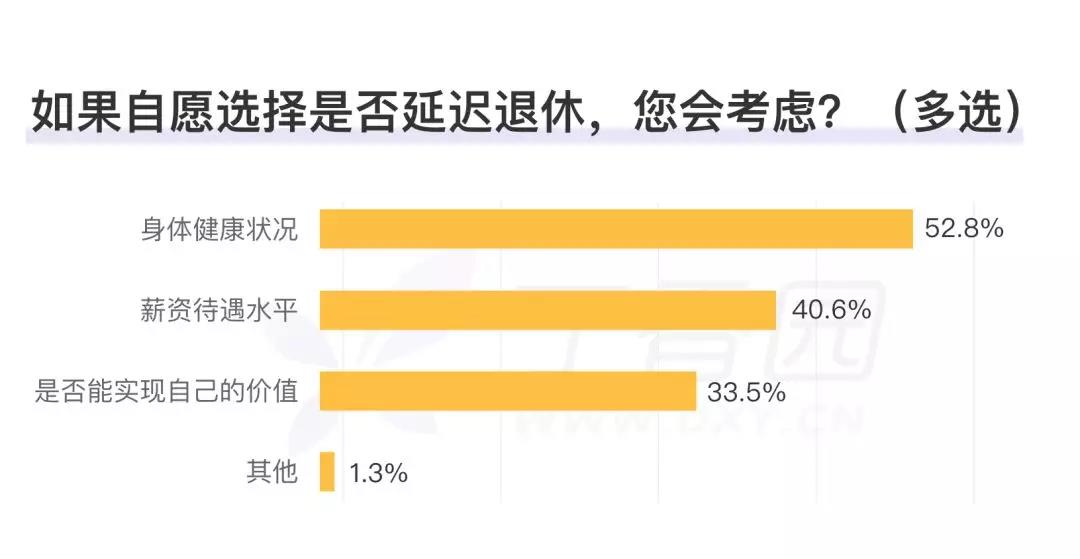 如果自愿选择是否延迟退休,52.8% 的参与者会考虑身体健康状况,40.6% 会考虑薪资待遇水平。