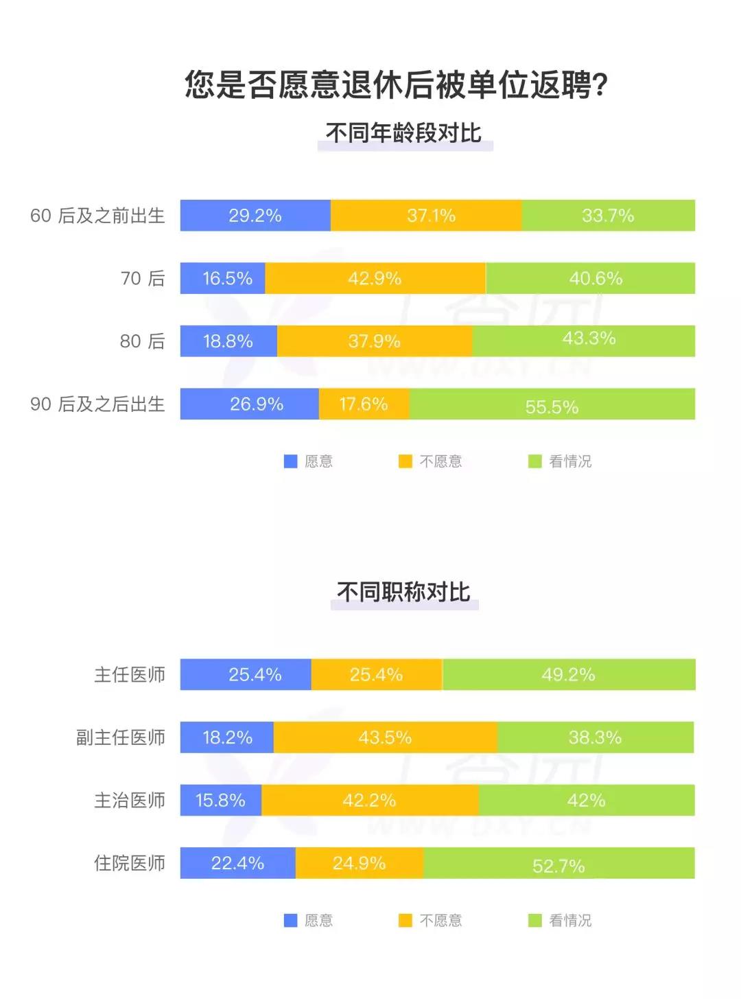 延迟退休的政策关系每个人的切身利益,通过本次调查可以看出,相对来说,年轻医生更想提前退休,年老医生更想延迟退休。