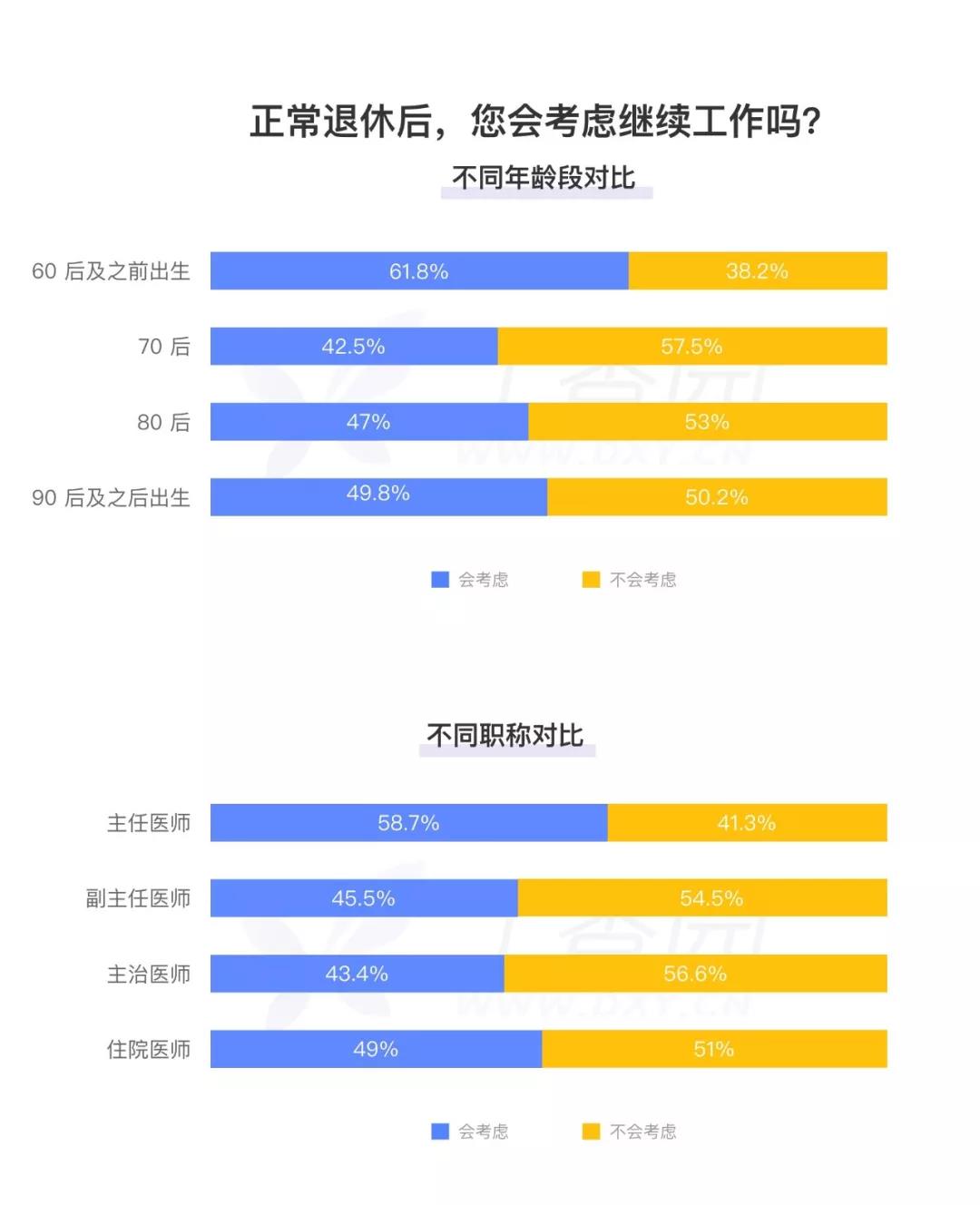 60 后及之前出生的医生中有 61.8% 会考虑在正常退休后继续工作,明显高于其他年龄段。