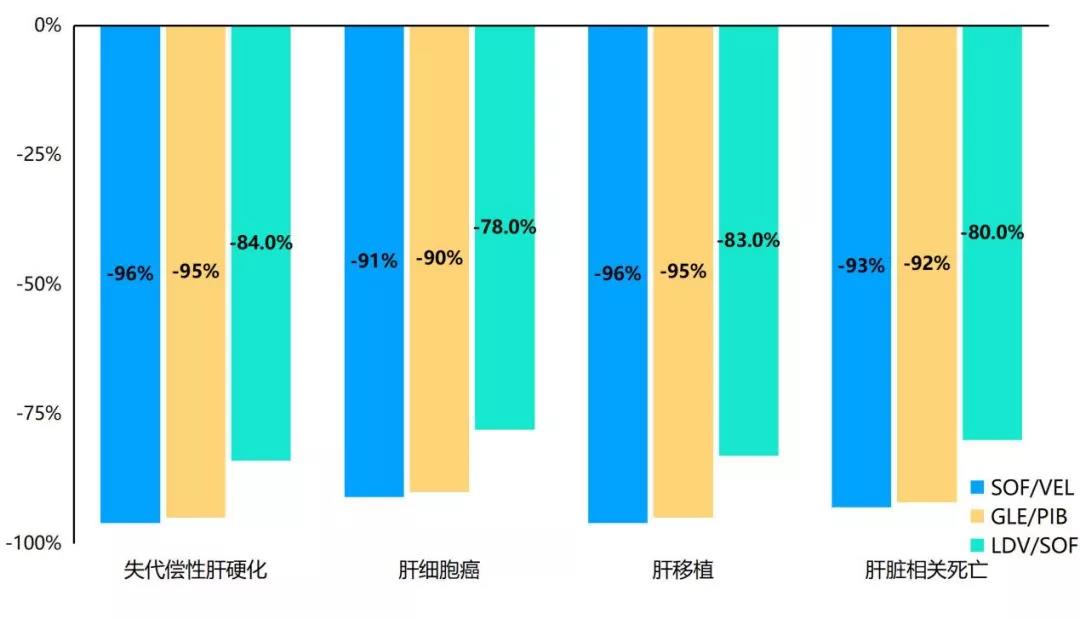 结果显示,在所有基因型人群,SOF/VEL 均能获得最高的 SVR (99.2%),相比之下,格卡瑞韦哌仑他韦 (GLE/PIB) 为 98.3%,PR 为 39.0%。在所有患者人群中,SOF/VEL 治疗与 PR 治疗相比,对晚期肝脏疾病事件的减少幅度最大,如图2。