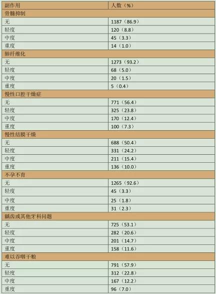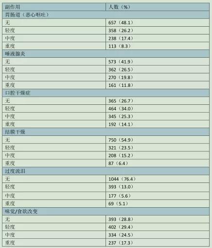 而最常见的长期副作用是慢性干眼症(干眼症 24%)和慢性口腔干燥症(24%),一般在治疗后持续数月至数年。其余不良反应详见表一和表二。