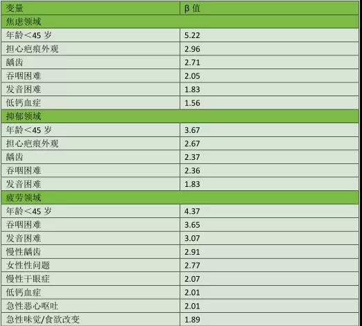 诊断时间与焦虑,抑郁,疲劳和睡眠障碍都呈负相关,并且在进行单变量分析时也与身体和社会功能直接相关。详细数据见表三。