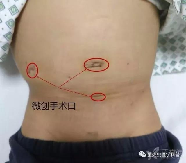幸运的是,经过 2 小时的努力,我们微创切下阑尾,只留下 2 个 10 mm 切口和 1 个 5 mm 切口。