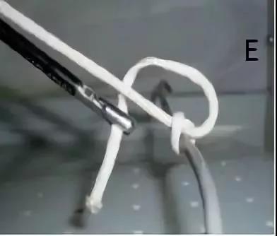 松开分离钳夹住的丝线端,把分离钳从「O」形环中抽出,再次从「O」形环的外面夹住丝线端,体外体内同时收紧,这时完成前半结(图 D);