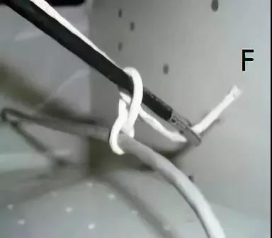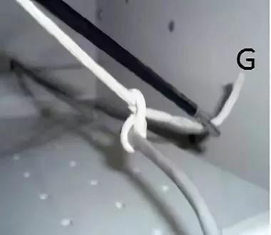 再次松开分离钳所夹的线端,抽出分离钳,在「O」形环外夹住丝线端,同时体内外同时收紧线结完成一个方结(图 G),同法打后继的第二和第三个结。
