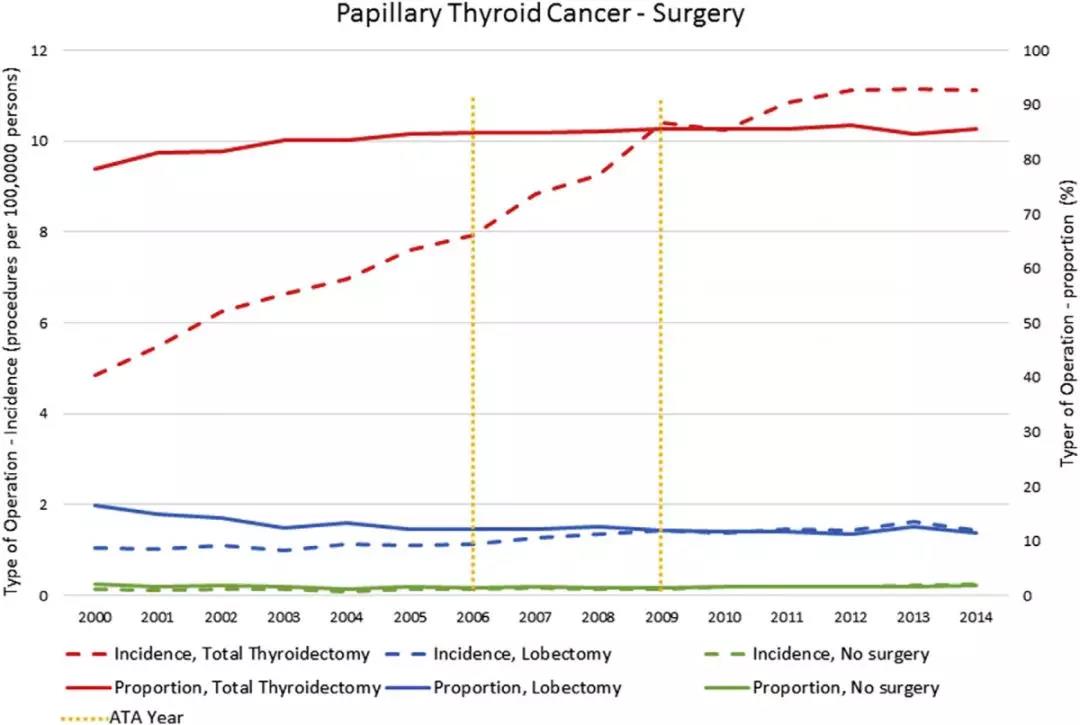 2000 年至 2014 年,PTC 的发病率翻了一倍,从 6.2 人/10 万人增加到 13 人/10 万人。行甲状腺全切术的比例从 2000 年的 78.16% 增加到 2014 年的 85.67%,但甲状腺腺叶切除术则从 16.62% 降至 11.41%。