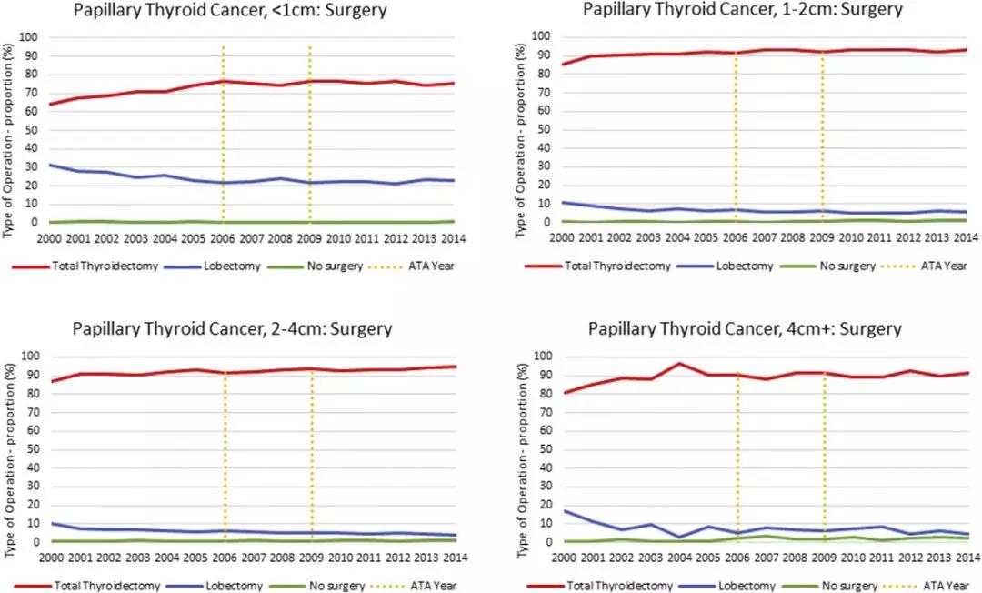 对于<4 cm 的肿瘤,研究发现行甲状腺全切术的比例每年在增加,而甲状腺腺叶切除术则降低。