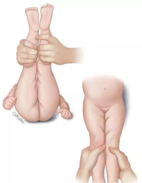 (3)相对于“皮纹不对称”,看孩子有没有“双腿不等长(Galeazzi征)”和“髋关节外展受限”,更简单靠谱。