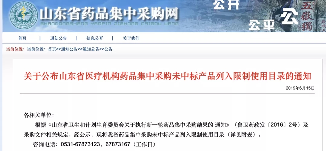 6月15日,山东省药品集中采购网发布《关于公布山东省医疗机构药品集中采购未中标产品列入限制使用目录的通知》(以下简称《通知》)。