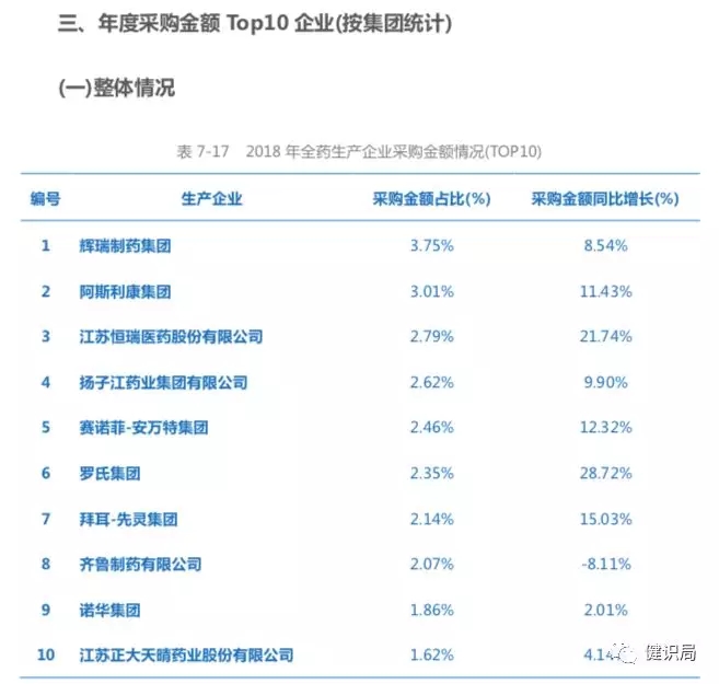 其中,采购金额同比增长超10%的企业有阿斯利康、恒瑞医药、赛诺菲、罗氏及拜耳,仅齐鲁制药采购金额呈负增长。