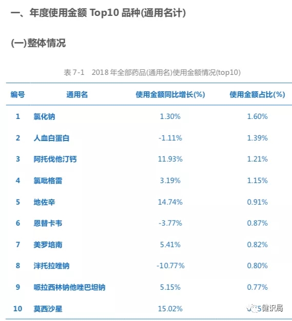 在药品采购的排行中,排名年度使用金额Top10第一位的为氯化钠(通用名),使用金额占比为1.6%。紧随其后的包括人血白蛋白、阿托伐他汀钙、氯吡格雷、地佐辛 、恩替卡韦 、美罗培南、泮托拉唑钠、哌拉西林钠他唑巴坦钠,及莫西沙星 。