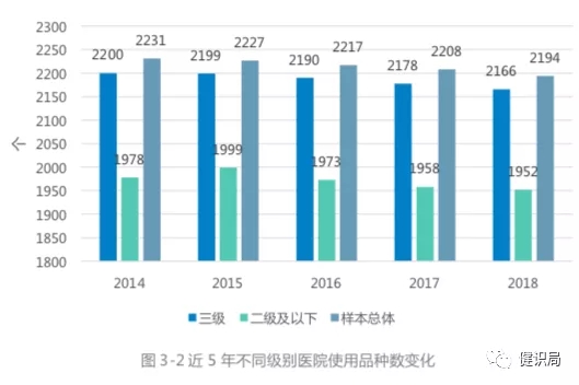 过去5年,样本医院总品种数小幅减少,从2014年的2231种减少到2018年的2194种,退出182个品种,新增145个品种,净减少37个品种。