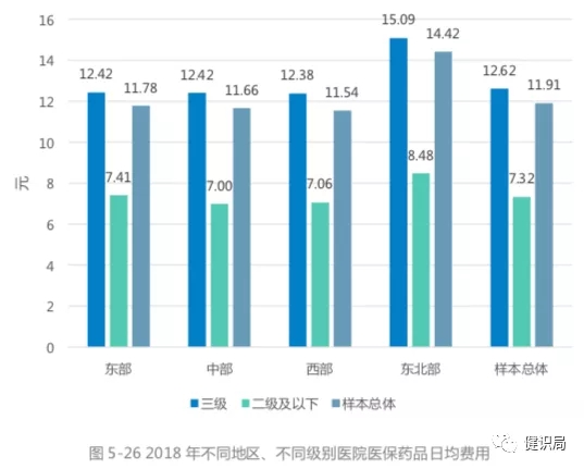 日均费用而言,样本总体2018年为11.91元。从医院级别来看,三级医院医保药品日均费用为12.62元,二级及以下医 院为7.32 元。近5年样本医院医保药品日均费用基本稳定,样本医院医保药品日均费用5年复合增长率为2.01%。