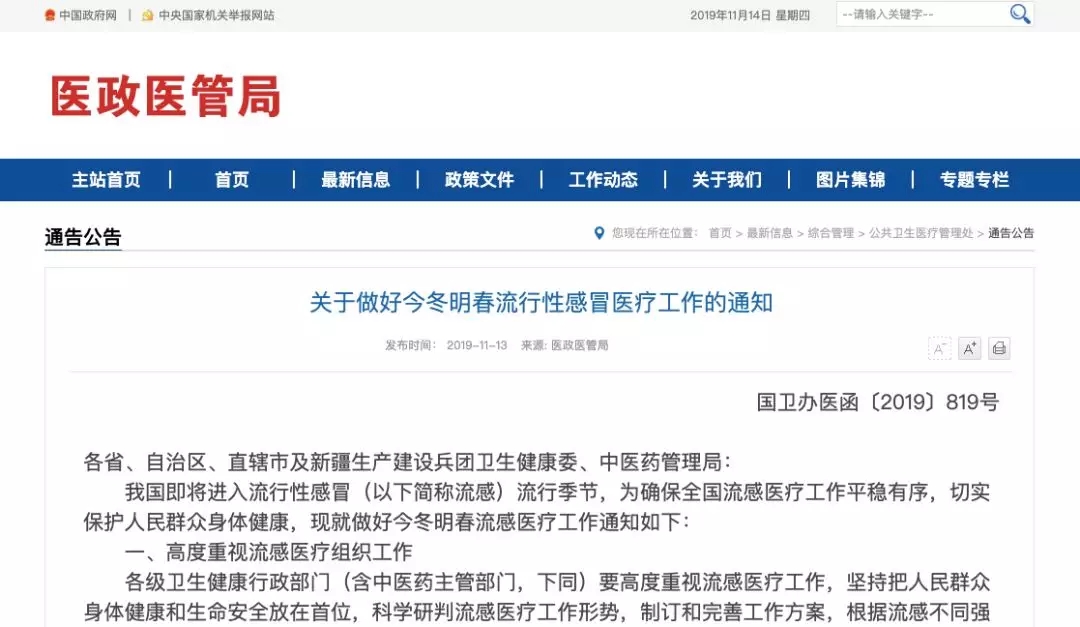 11月13日,国家卫健委发布《关于做好今冬明春流行性感冒医疗工作的通知》称,各级各类医疗机构要进一步提高流感规范化诊疗水平,对有流感重症高危因素的患者尽早予以抗病毒治疗,强化规范用药,防止药物滥用。