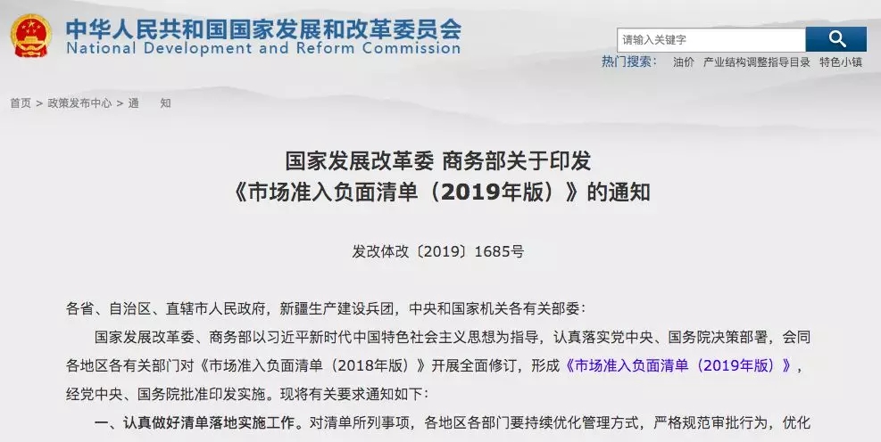 11月22日,国家发展改革委、商务部联合发布《市场准入负面清单(2019年版)》,包括131项内容,其中5个为禁止事项,126个许可事项。