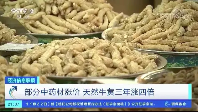 在此次调查中,央视记者发现涨价最为明显的是天然牛黄。河北安国中药材交易市场商户吕建龙表示,2016年天然牛黄的价格大约在9万-10万元/公斤,到现在价格已上涨至的50万左右/公斤。