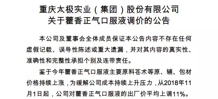 这直接导致了中药生产企业直接提高了终端的零售价格。2018月11月,太极集团发布调价公告称,自今日起公司对藿香正气口服液的出厂价平均上调11%。