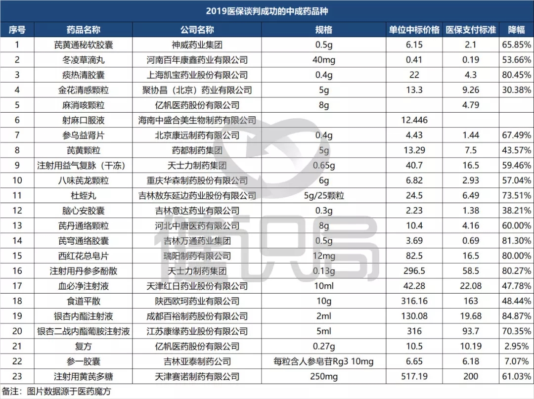 而降价的背后,更值得关注的是,在本轮医保谈判中,共有18个中成药品种顺利入围。同时,亦有在2017年医保目录成功续约的5个品种,使得23个中成药品种进入2019版医保目录。