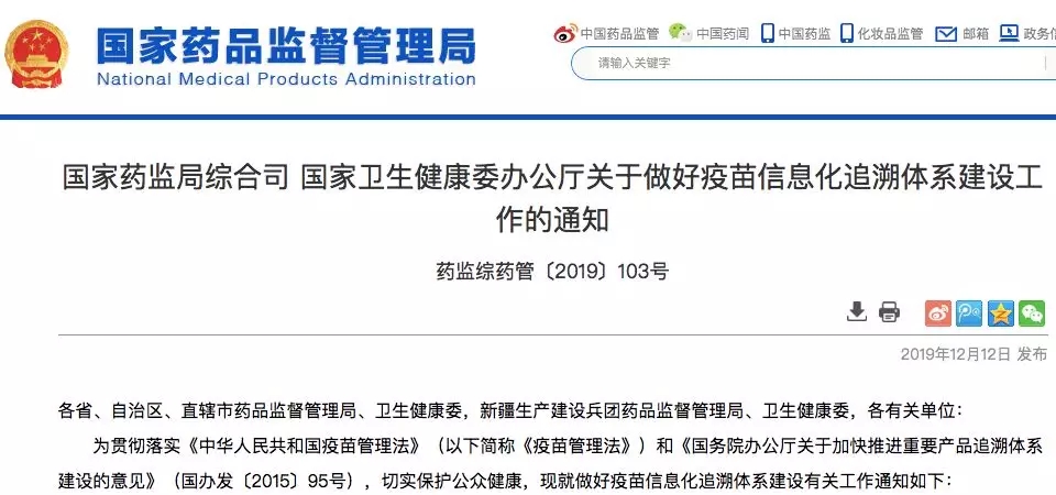 12月12日,国家药监局、国家卫健委联合发布《关于做好疫苗信息化追溯体系建设工作的通知》(简称“通知”),明确要求建立覆盖疫苗生产、流通和预防接种全过程的信息化追溯体系,实现全部疫苗全过程可追溯,做到来源可查、去向可追、责任可究,切实保障疫苗质量安全。