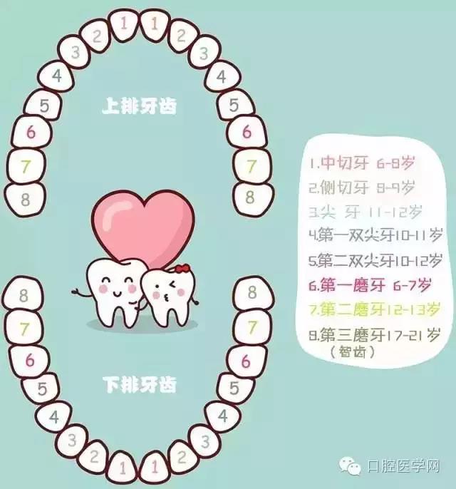 1)在儿童6-8岁时开始长第一颗恒牙,即中切牙,第一磨牙也慢慢长出;