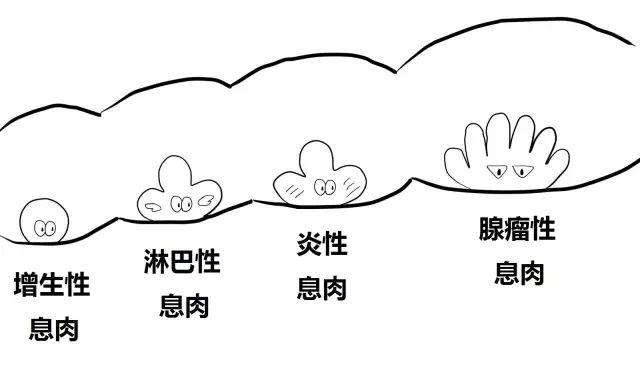 大肠癌早期只是一个普普通通的小息肉,肠道息肉可以分为:增生性息肉、淋巴性息肉、炎性息肉、腺瘤性息肉等等。