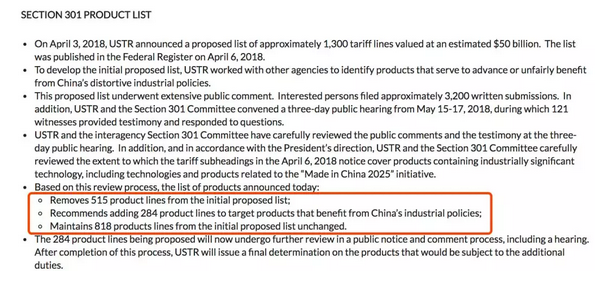 事实上,USTR公布对华课税商品清单后,经过了两个月公众意见审核。按照USTR官网信息,这期间共收到约3200份书面意见书,最终决定: