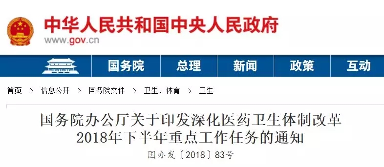 8月28日,中国政府网发布《深化医药卫生体制改革2018年下半年重点工作任务》(以下简称《任务》)。要点如下:
