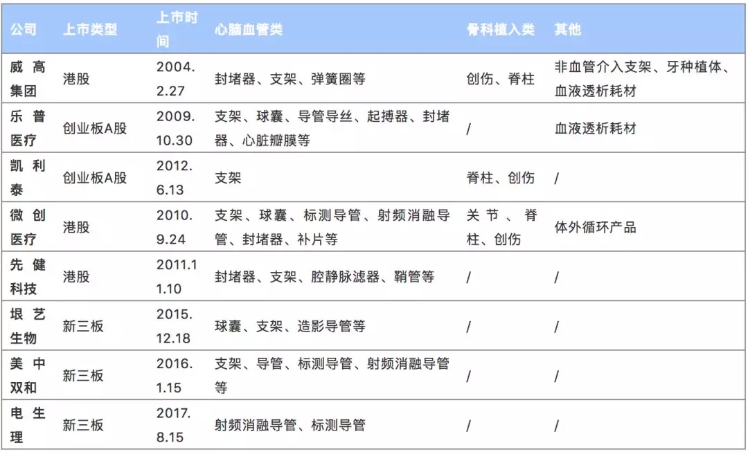 国内布局血管介入器械的上市或新三板挂牌公司有威高集团、乐普医疗、微创医疗、先健科技、凯利泰、垠艺生物、美中双和等。
