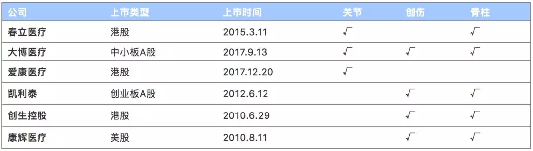 国内骨科植入物领域具有代表性的上市企业除了上述的威高和微创医疗之外,还有春立医疗、大博医疗、爱康医疗、凯利泰、创生控股和康辉医疗等。