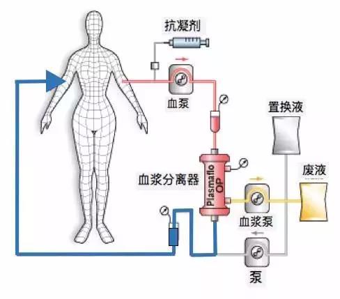 血浆置换,也就是「置换血浆」,是把患者体内的血浆与血细胞分离并弃去,以等量的新鲜冷冻血浆或人血白蛋白等置换液取而代之。弃去的血浆中存在大大小小的代谢毒素,这样一来,它们便被成功丢弃,而补充的置换液中存在凝血因子、白蛋白等必需物质则及时进入循环,尤其是对于肝功能衰竭的病人,这些物质也算是神兵天降,可以较好地替代肝脏的部分功能。