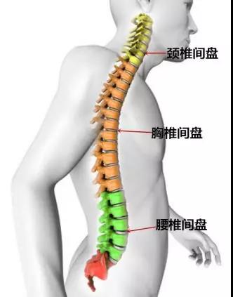 脊柱共分为四个部分,如图所示:浅黄色部分为颈椎,该部分的间盘叫做颈椎间盘;橘黄色部分为胸椎,该部分的间盘叫做胸椎间盘;绿色部分为腰椎,该部分的间盘叫做腰椎间盘;虽然部位不一样,但各个部位的椎间盘结构和功能是相同的。
