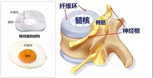 软骨板就像是两面薄煎饼,是夹着椎间盘上下的两个片,紧贴着相邻的上下两块椎骨,质地坚韧,中央部的纤维环和髓核就像是煎蛋的蛋清和蛋黄。髓核(蛋黄)位于椎间盘的中央部,是一个含水量很多的弹性胶状物质,可以减少运动时头部与脊髓的震荡。纤维环(鸡蛋清)位于髓核四周,将髓核层层紧密包绕,纤维环质地坚韧结构紧密,能帮助脊柱承受较大的弯曲和扭转负荷。