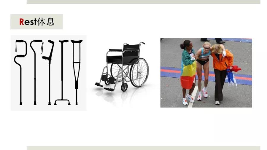Rest休息的另一层含义就是免负重,脚不踩地,让踝关节充分的免负重休息,避免损伤进一步加重,同时也为机体组织的修复提供良好的环境。我们可以依靠各式各样的拐杖、轮椅、别人搀扶等方式,让踝关节充分的免负重休息。