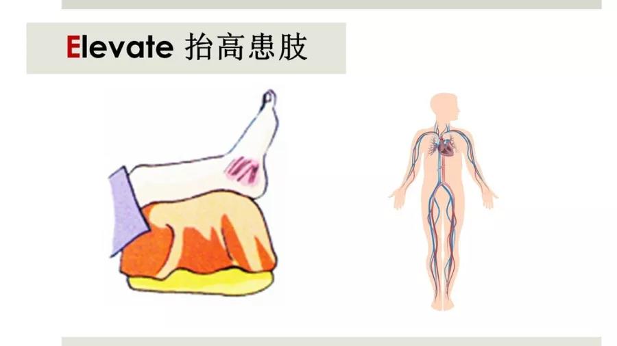 踝关节扭伤急诊处理的第4个原则就是Elevate ,抬高患肢,在休息的时候,尽量选平卧位,踝关节下方垫一个被子或者是枕头,让肿胀的踝关节比心脏位置高,增加静脉的回流,可以减轻肿胀和疼痛。