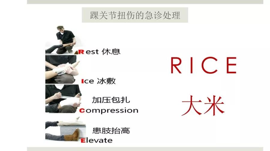 让我们再一起回顾一下,我们刚才用到的4个处理原则,Rest休息, Ice冰敷,Compression 加压包扎,Elevate 抬高患肢 ,他们的英文首字母R- I- C- E加在一起就组成了rice,大米的英文,这样就很好记了吧?下次遇到类似的情况,您一定也会处理了吧!