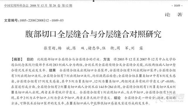 引自论文《腹部切口全层缝合与分层缝合对照研究》,作者及来源如截图所示