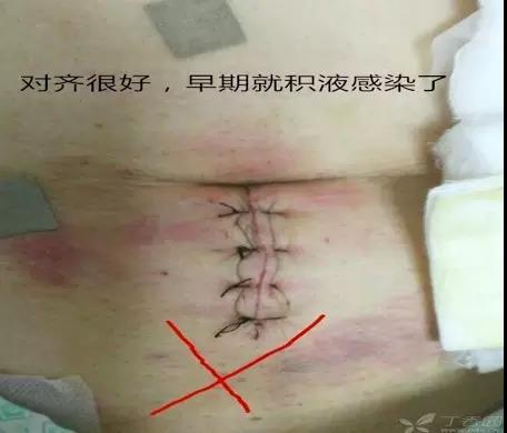 腹部正中切口脐上不需要缝合腹膜,脐下需缝合腹膜,皮下脂肪层再厚也不需要缝合,缝合只会增加异物且积液难以溢出;皮肤缝合也主张不要过密,打结皮肤靠上即可,不需要勒的太紧,太紧影响血供且切割皮肤形成明显「蜈蚣脚」瘢痕;鞘缝好后,皮下坏死脂肪的清除,切口的冲洗及皮下出血的确切止血也非常重要!