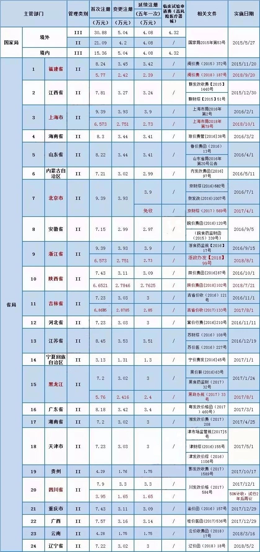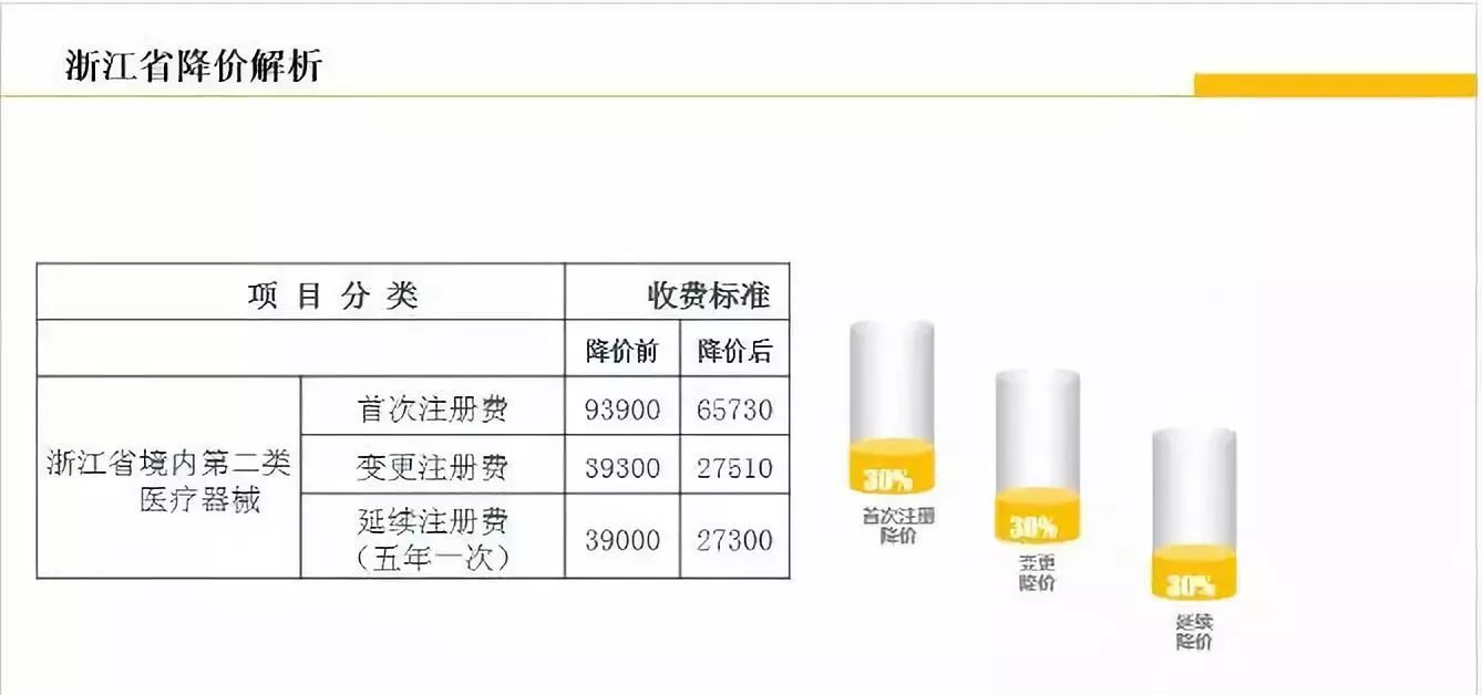 浙江省人民政府办公厅于2018年10月17日印发《关于进一步减轻企业负担增强企业竞争力的若干意见》,意见第四条“停征一批行政事业性收费”中规定“自2018年8月1日起,药品、医疗器械产品注册费在现行基础上下调30%”。
